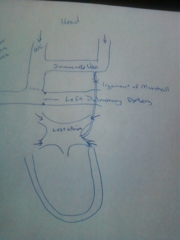 Jani also explained a little more about Abigail's surgery and sent me a little diagram trying to show the problem that the surgeons are trying to fix. This vein, called a ligament of Marshall, normally does not have a blood flow. For some reason it has started to bring deoxygenated blood from the superior vena cava into the left atrium mixing both oxygenated and deoxygenated blood causing Abigail's oxygen saturation levels to be low. The surgeons are hoping that by putting a coil on the vein they will prevent further blood flow and this will raise her oxygen saturation levels. Hopefully this is the only problem and the pulmonary artery is only swollen and not too small to handle the blood flow.